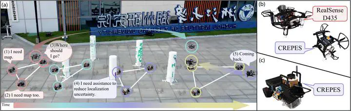 Image credit: FAST-FIREMulti-robot system is desired to achieve global cost-efficiency by fully utilizing individual advantages. For example, leveraging unmanned aerial vehicles’ (UAVs’) agility for inspection and ground vehicles’ (UGVs’) capability for heavy-duty tasks. Coordinating the motion of multiple robots smartly is complex and it becomes more challenging when robots in the swarm are not equipped with sufficient sensors for environmental perception (e.g. in our case only one robot has a depth camera). In this letter, we propose a tightly coupled systematic framework to navigate a swarm composed of UAV and UGVs in unknown scenes. The system has only one depth camera with a field of view for environmental perception. We fully explore the cooperation between robots by proposing a Sequential Exploration and Aiding Localization (SEAL) planning strategy for the UAV and a Collision-Adaptive Trajectory (CAT) optimization for UGVs. The UAV assists UGVs’ localization with relative pose estimation and own global localization, meanwhile, it focuses on exploration to provide UGVs with abundant environmental information. The UGV team can navigate safely and autonomously in obstacle-rich environments and even maintain formations with only the wheel odometer and UAV’s assistance using CAT optimization. Our method is validated both in simulations and real-world experiments indoors and outdoors.